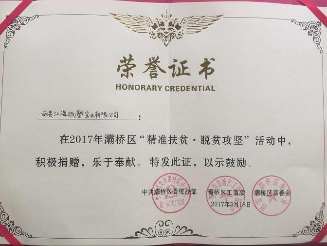 我公司在2017年灞桥区“精准扶贫,脱贫攻坚”活动中,努力回报社会,积极捐赠,乐于奉献。
